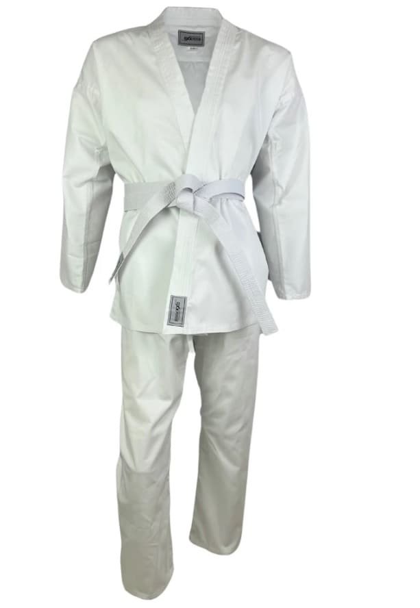 Кимоно каратэ для тренировок и соревнований. 100% хлопок, абсолютно белая ткань, плотность 380г/м2 для куртки, 330г/м2 для штанов, с белым поясом. Свободные длинные брюки удерживаются на поясне с шнурком и широкой вшитой резинкой.
