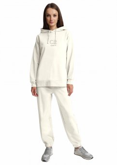 Комплект из трикотажного полотна футер 2-х нит.Толстовка со спущенной линией плеча. По горловине капюшон со шнуром. По низу изделия,рукавов манжеты.Спереди принт.Брюки свободного кроя с внутренней резинкой по талии и низу, в боковых швах карманы.