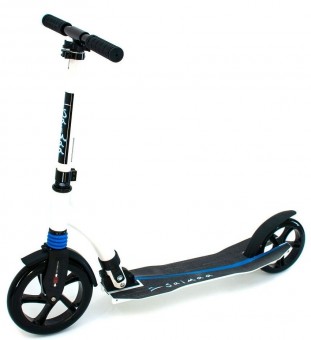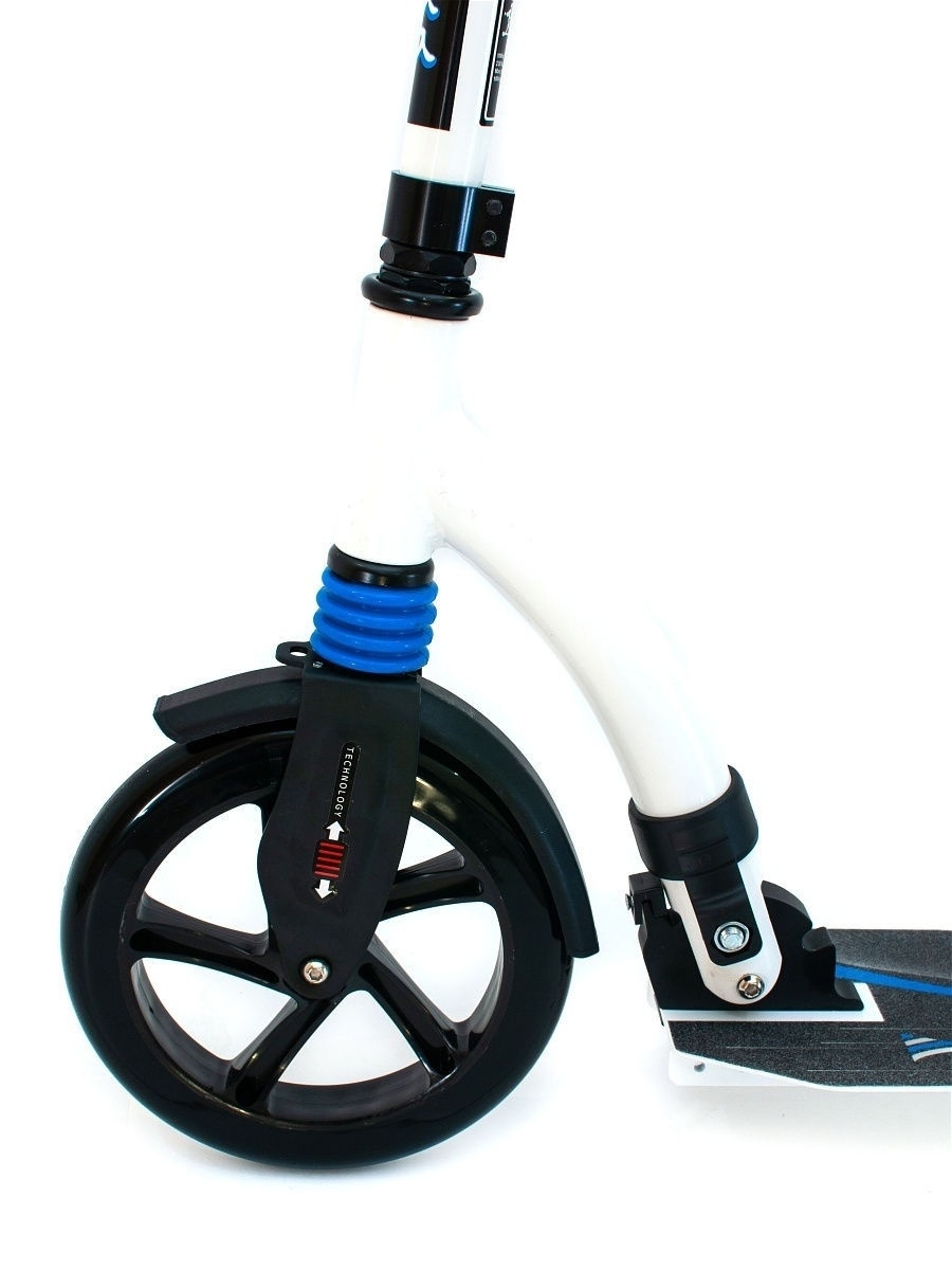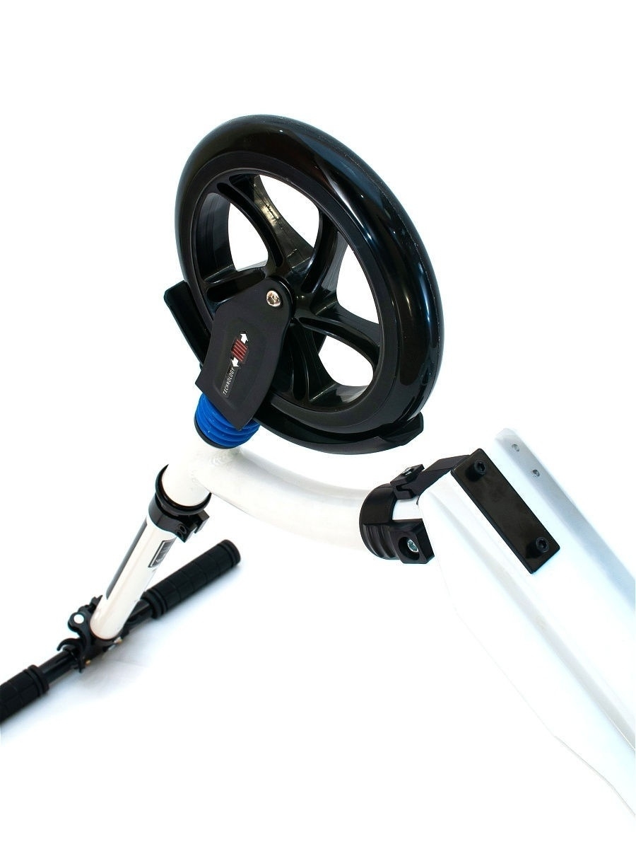 - Диаметр переднего колеса 230 мм, заднего – 180 мм. Промышленный подшипник ABEC-7. Самокат оснащен передним амортизатором, что обеспечит комфорт в использовании.