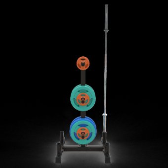 Стойка для хранения дисков и грифов DFC D875. Максимальная нагрузка до 100 кг, профиль основной рамы 50х50х2 мм. Подходит для дисков диаметром 26 мм, длина посадочного места 22,5 см. Расстояние между держателями дисков составляет 48 см в высоту.