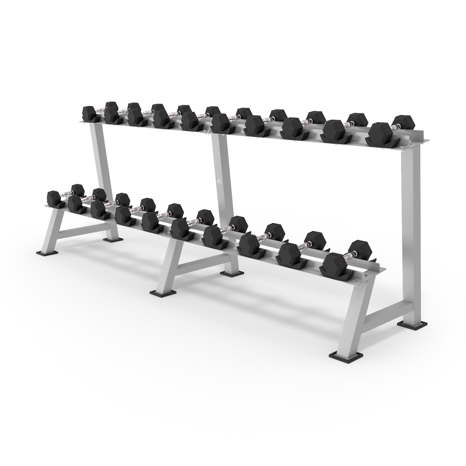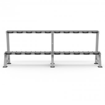 Стойка выдерживает нагрузку до 500 кг, на ней можно хранить до 10 пар гантелей весом от 12,5 до 50 кг . Все элементы выполнены из стали повышенной прочности.