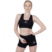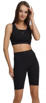 Топ женский укорченный спортивный из эластичного плотного полотна. Широкая бретель. Круглый вырез горловины. Двойной перед с принтом пленкой.